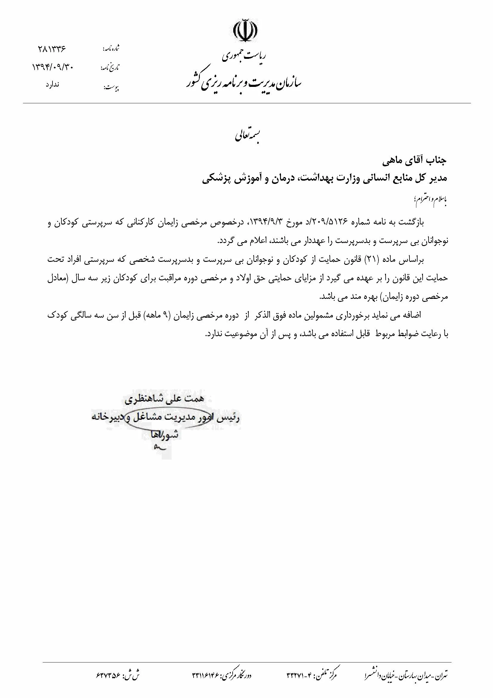 بخشنامه مرخصی زایمان کارکنان سرپرست کودکان بی سرپرست